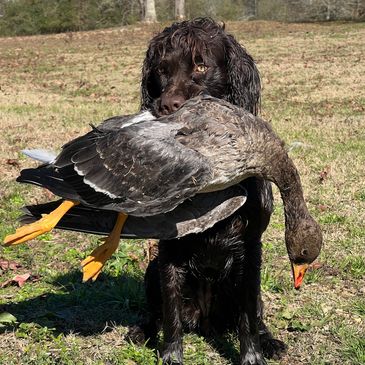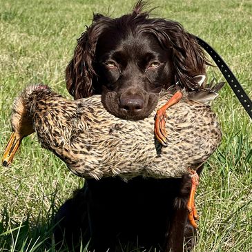 full obedience, collar conditioning, force fetch, and simple casting. This phase creates a dependable dog that responds cleanly to commands on and off lead. Confident with birds, gunfire, and decoys.