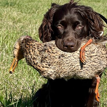 obedience, force fetch, and simple casting. This phase creates a dependable dog that responds cleanly to commands on and off lead. Confident with birds, gunfire, and decoys.